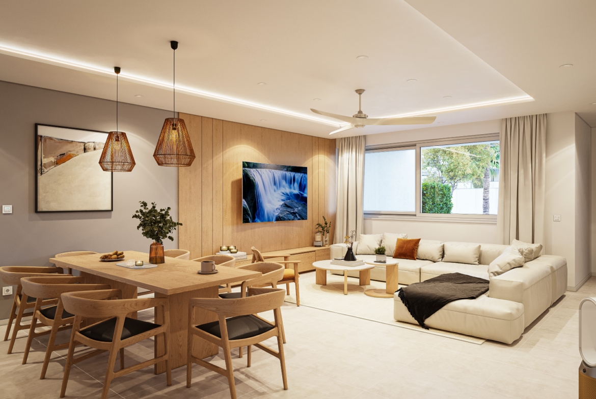 Access your home through an advanced electronic key card security system, leading into a spacious open-plan downstairs area. Bathed in natural light from large sliding glass windows, the living room seamlessly connects to a stylish dining area and a fully fitted Western kitchen, complete with a breakfast bar. A convenient guest W/C and a rear door that opens to a quaint garden area enhance the downstairs layout.