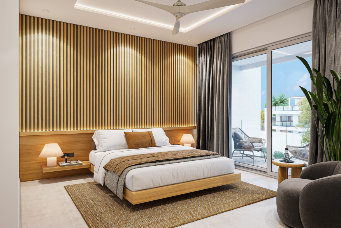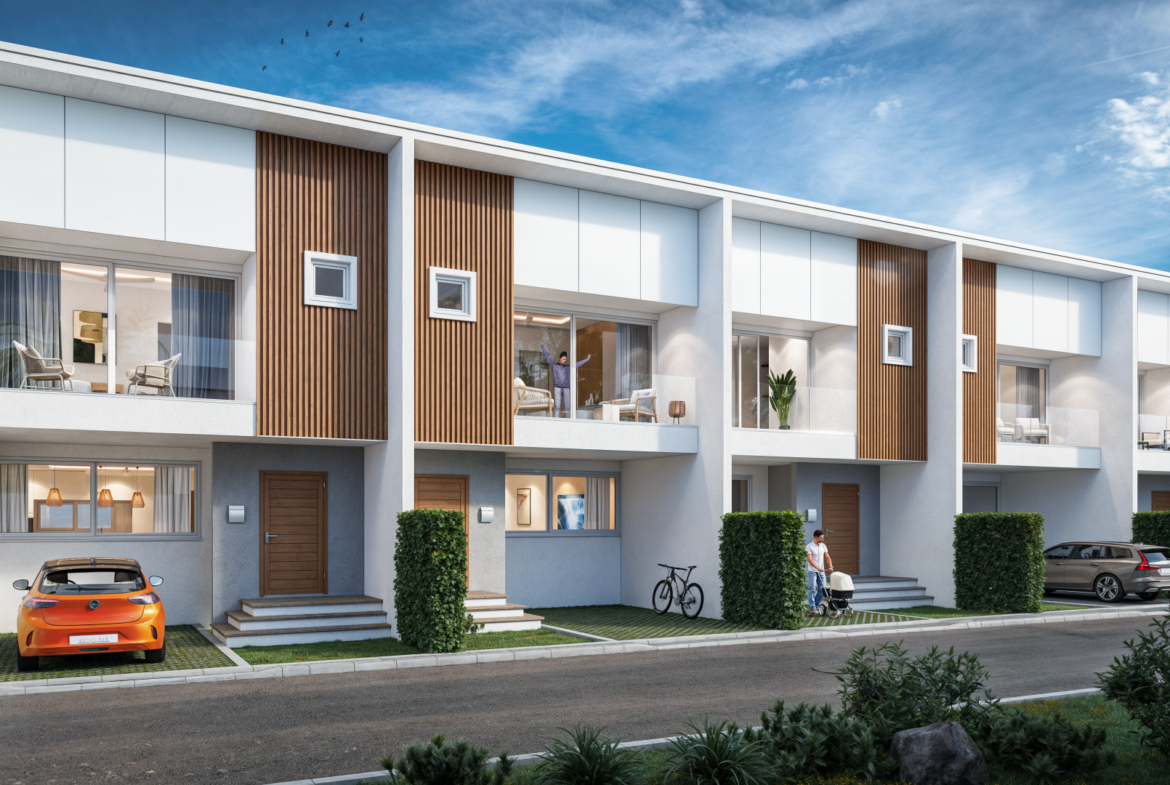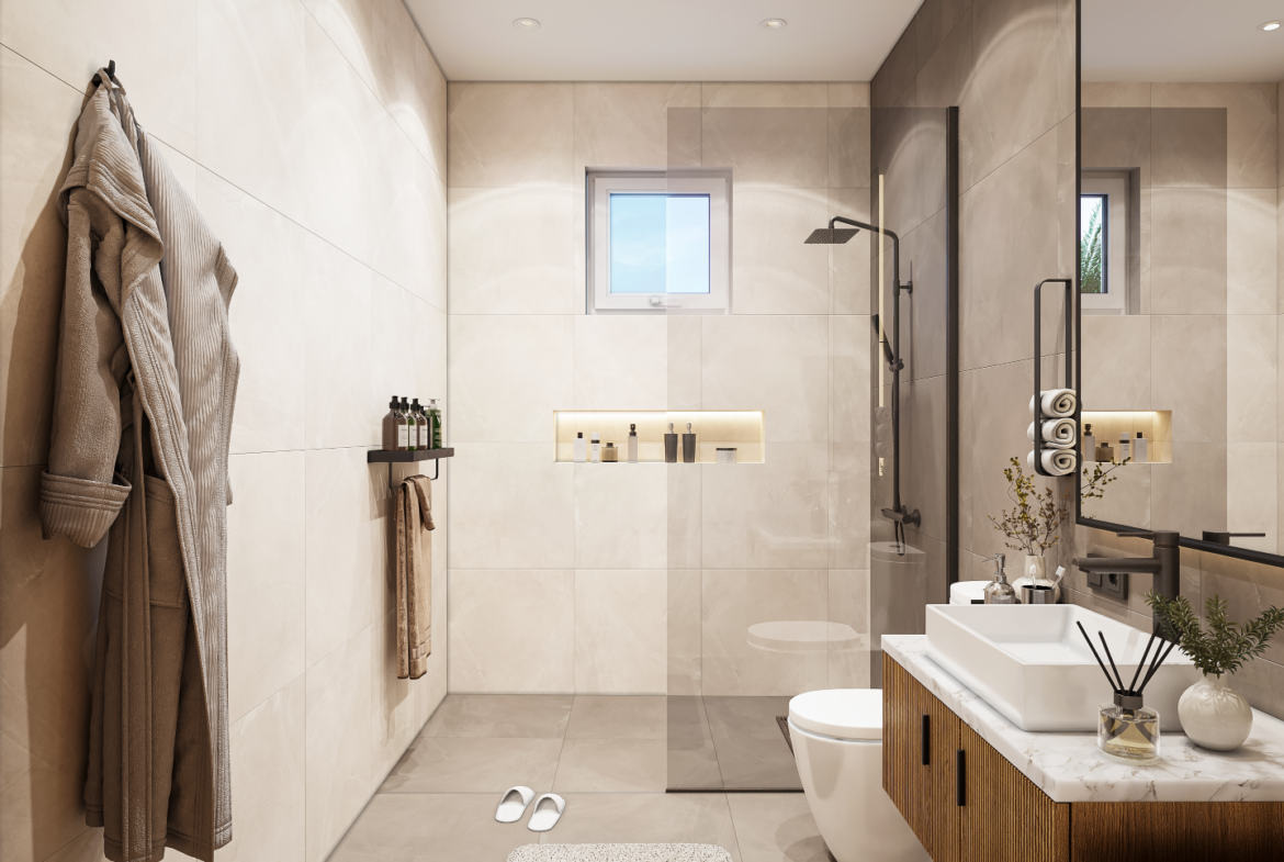 Ascend the staircase, conveniently located opposite the front door, to discover an inviting upper level. This space includes two generously sized double bedrooms at the rear, sharing a well-appointed bathroom. An office area provides the perfect spot for work or study, while the master bedroom, located at the front, boasts an en-suite bathroom. Townhouses 1 – 6 also benefit from a dressing area, and a private balcony—perfect for morning coffee or evening relaxation.