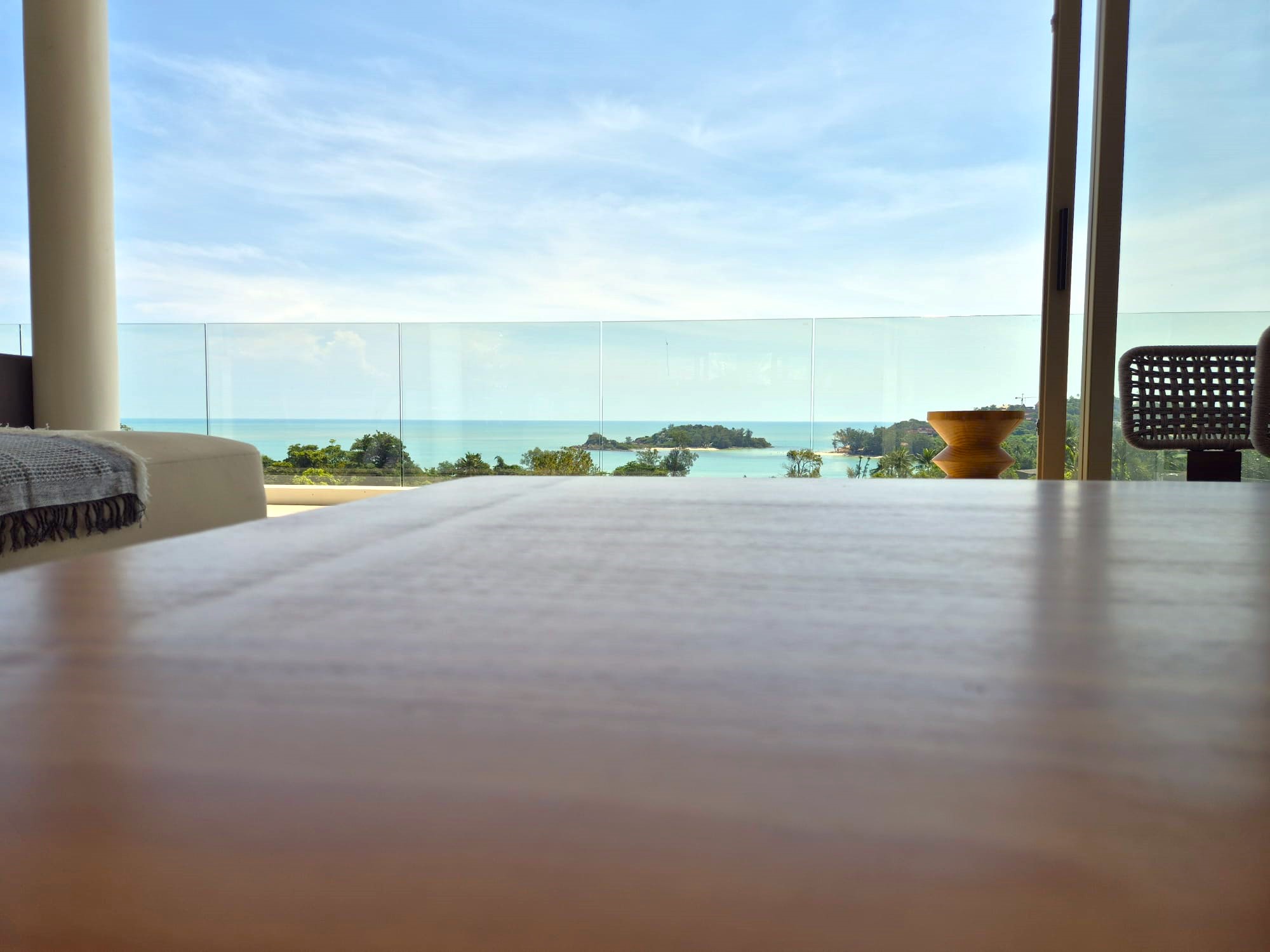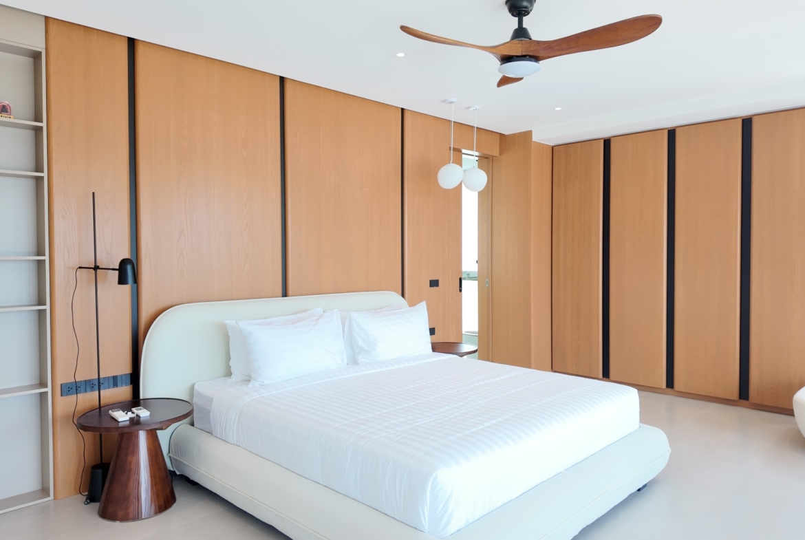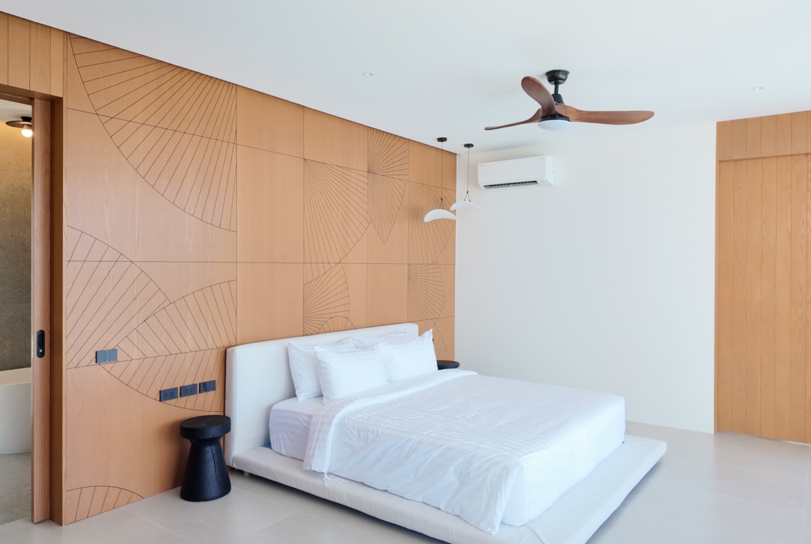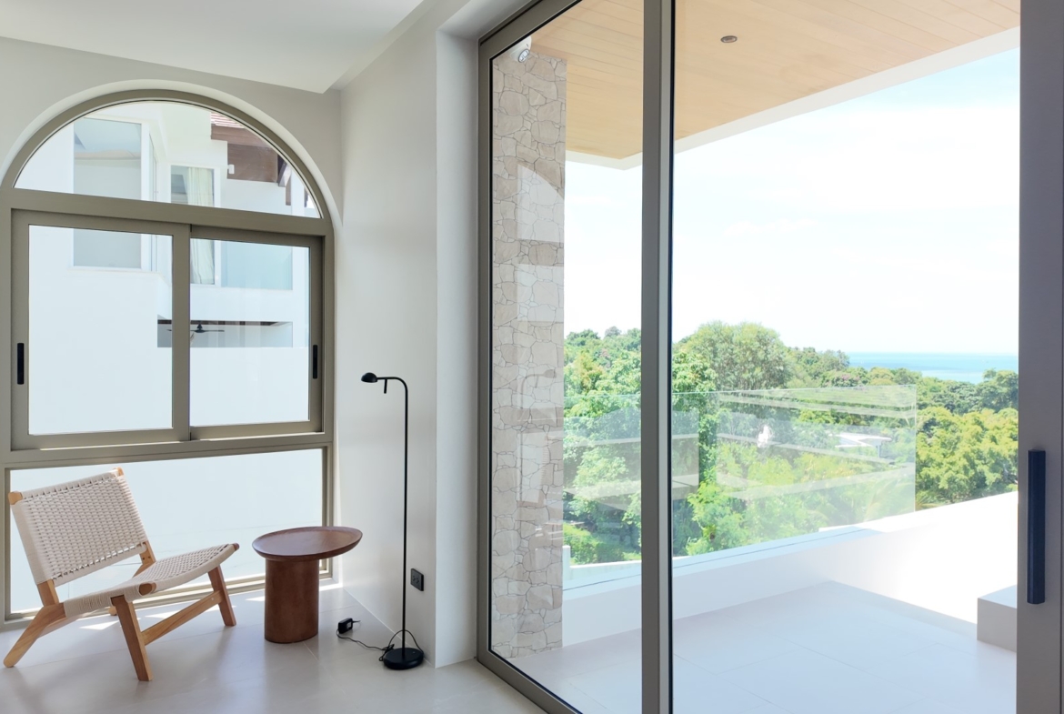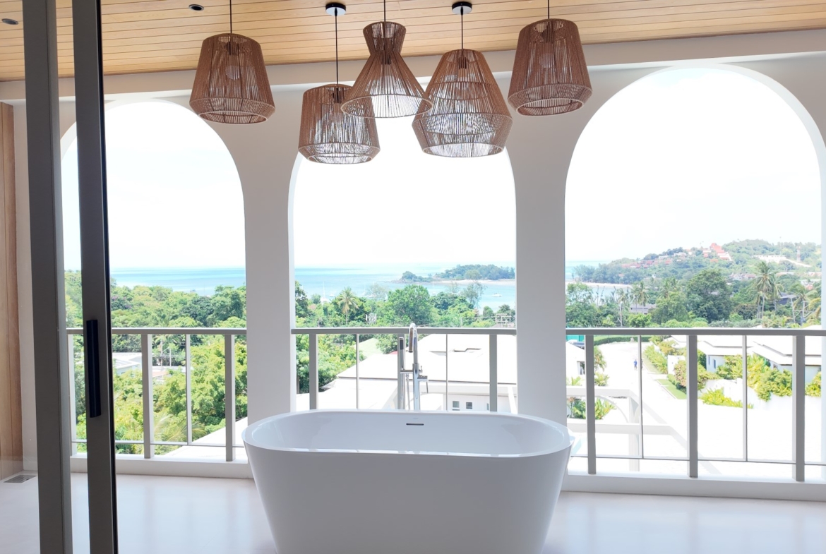 The upper level forms the heart of the home, featuring an expansive open-plan living, dining, and fully equipped kitchen area, along with the luxurious master bedroom complete with built-in wardrobes and an en-suite bathroom. The master suite also enjoys a private terrace with a freestanding bathtub, perfect for relaxing while taking in the stunning surroundings. Large sliding doors from both the living area and master bedroom open onto generous balconies overlooking Choeng Mon Beach, the turquoise sea, and Koh Fahn Island. Rear windows and doors allow cooling cross-breezes to flow naturally through the home.