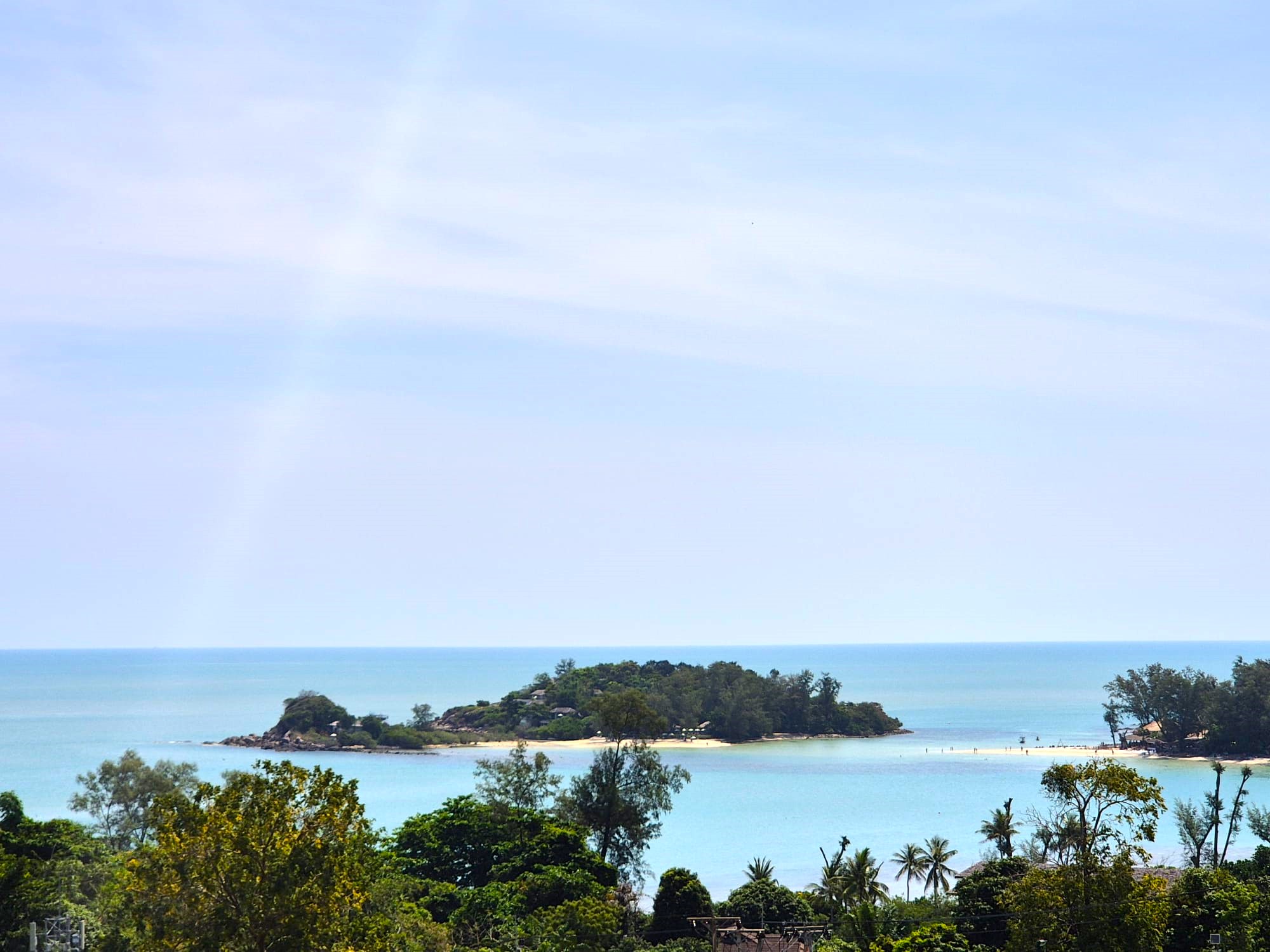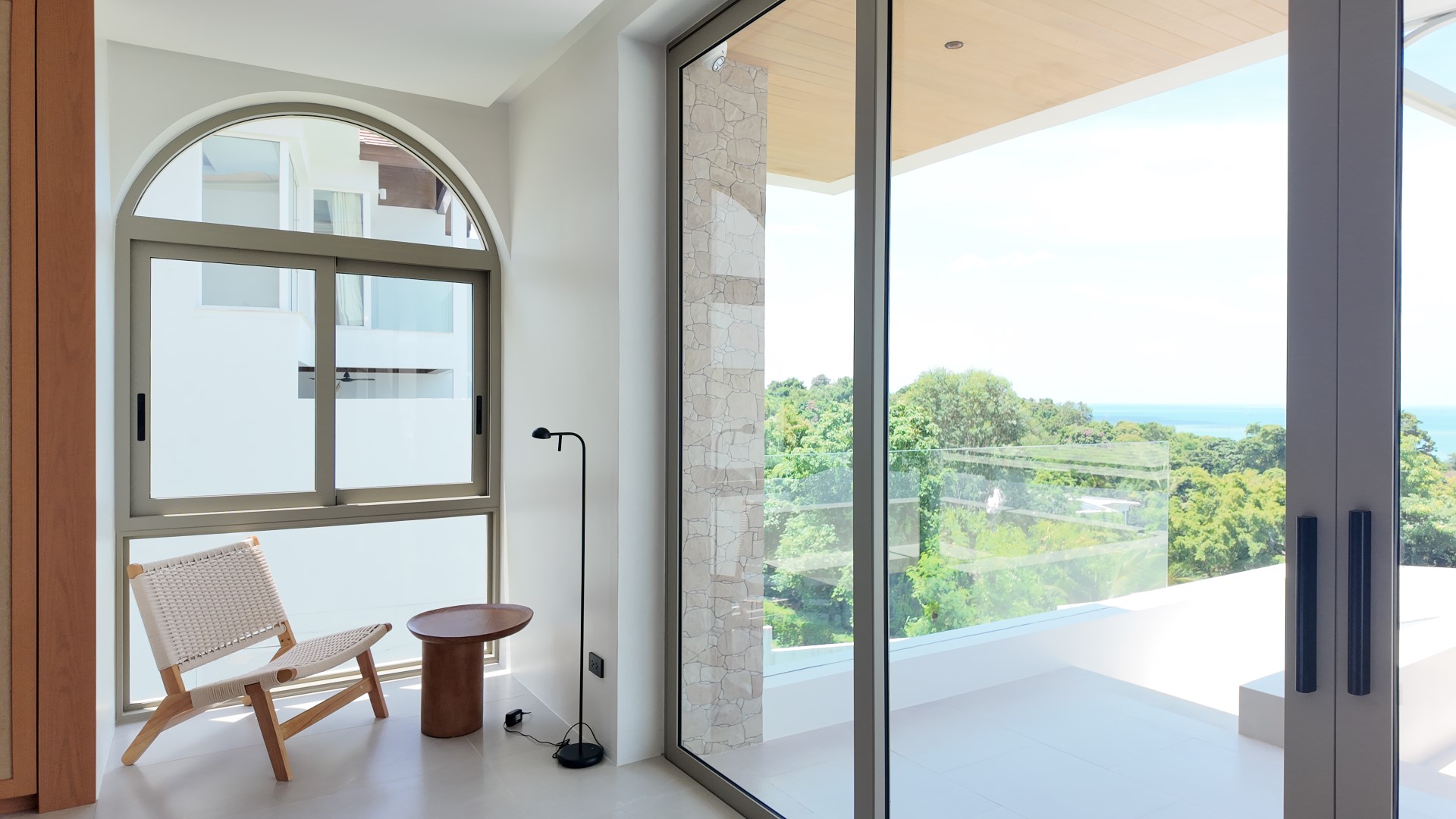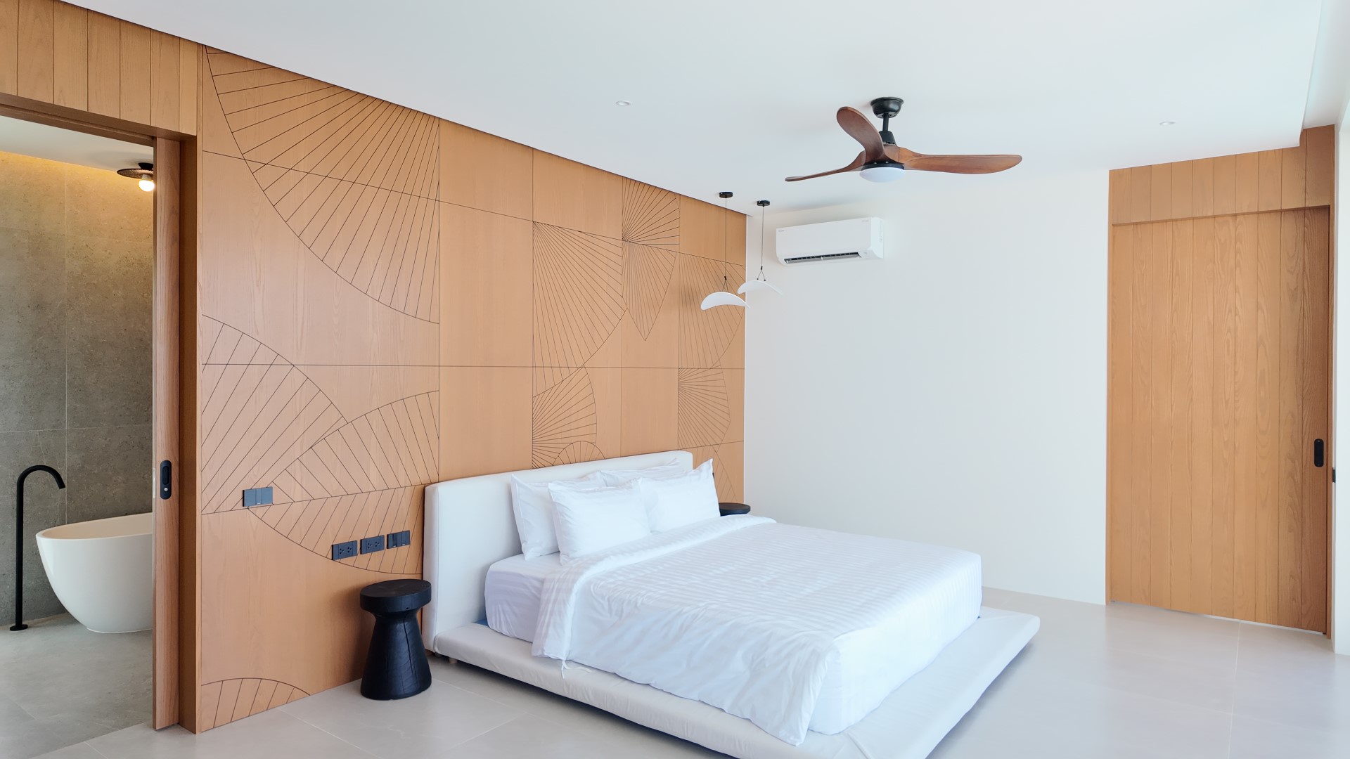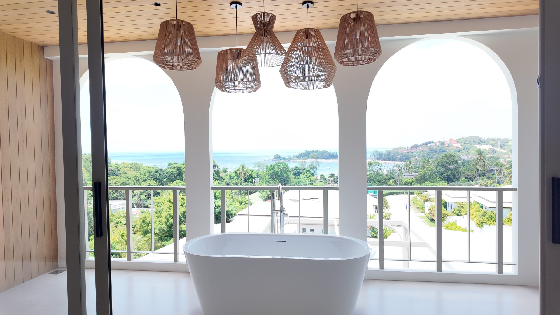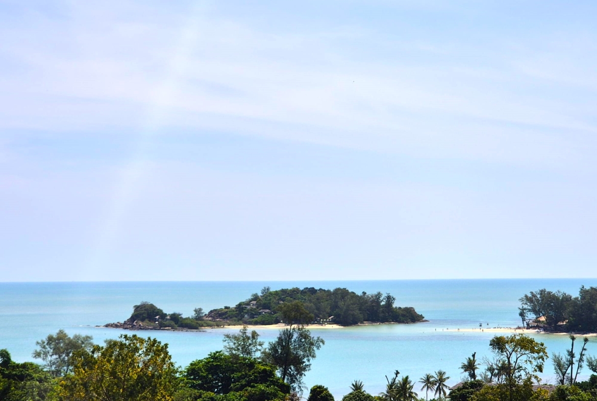 The upper level forms the heart of the home, featuring an expansive open-plan living, dining, and fully equipped kitchen area, along with the luxurious master bedroom complete with built-in wardrobes and an en-suite bathroom. The master suite also enjoys a private terrace with a freestanding bathtub, perfect for relaxing while taking in the stunning surroundings. Large sliding doors from both the living area and master bedroom open onto generous balconies overlooking Choeng Mon Beach, the turquoise sea, and Koh Fahn Island. Rear windows and doors allow cooling cross-breezes to flow naturally through the home.
