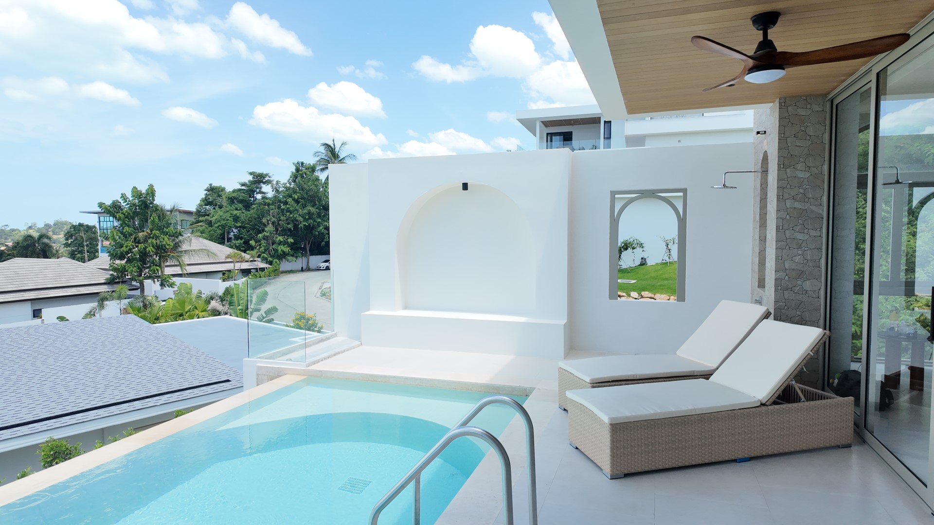 Outside, the pool terrace offers ample space for sun loungers, a sunken end-of-pool seating area, and an outdoor shower.
