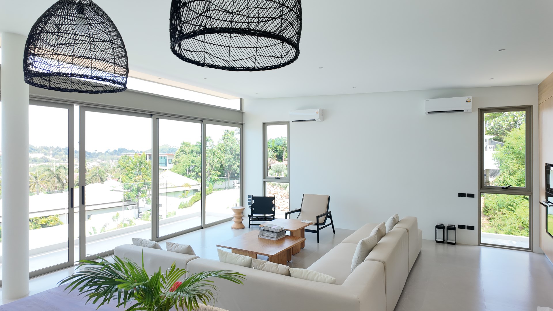 Sweeping steps lead up from the off-road parking area to impressive double entrance doors with digital keycode access. Upon entering, a cleverly designed layout reveals a hidden laundry and storage area to the right, while a striking floating staircase leads to the upper floor. The villa features an upside-down configuration, maximizing the spectacular views from the main living spaces above.