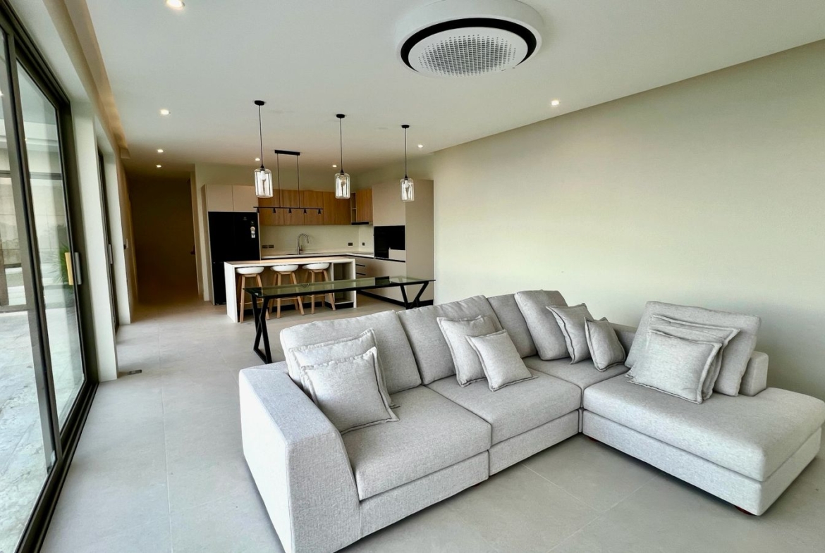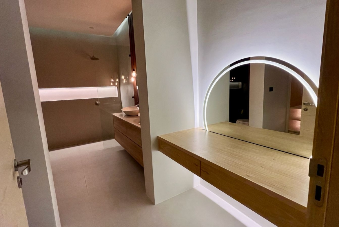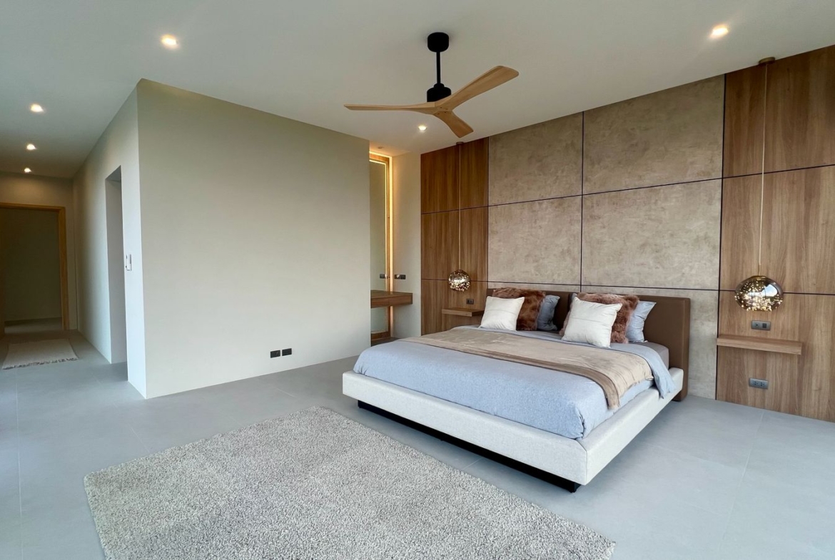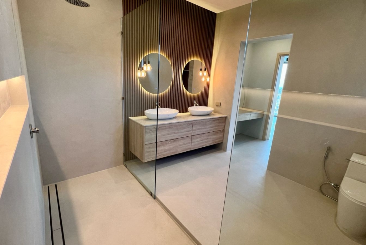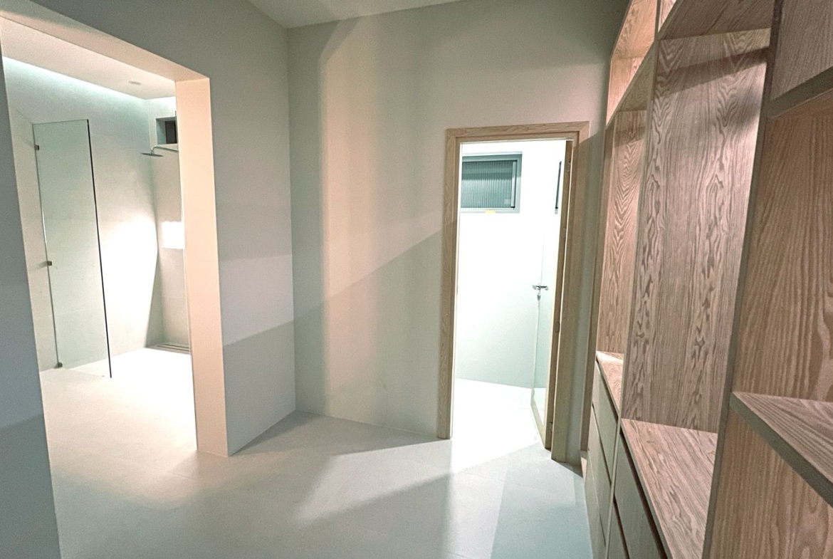 Spanning 305 SQM of meticulously crafted internal space, the villa is designed to maximize natural light through floor-to-ceiling glass sliding doors. The heart of the home is a bespoke Western kitchen, fully equipped with state-of-the-art Bosch appliances, flowing seamlessly into a living area featuring custom-made luxury furniture. An elegant winding staircase, anchored by a statement chandelier, leads you to three spacious en-suite bedrooms. The 50 SQM master suite is a true sanctuary, featuring handcrafted wardrobes and decorative wall paneling that reflect the home’s premium finishes.