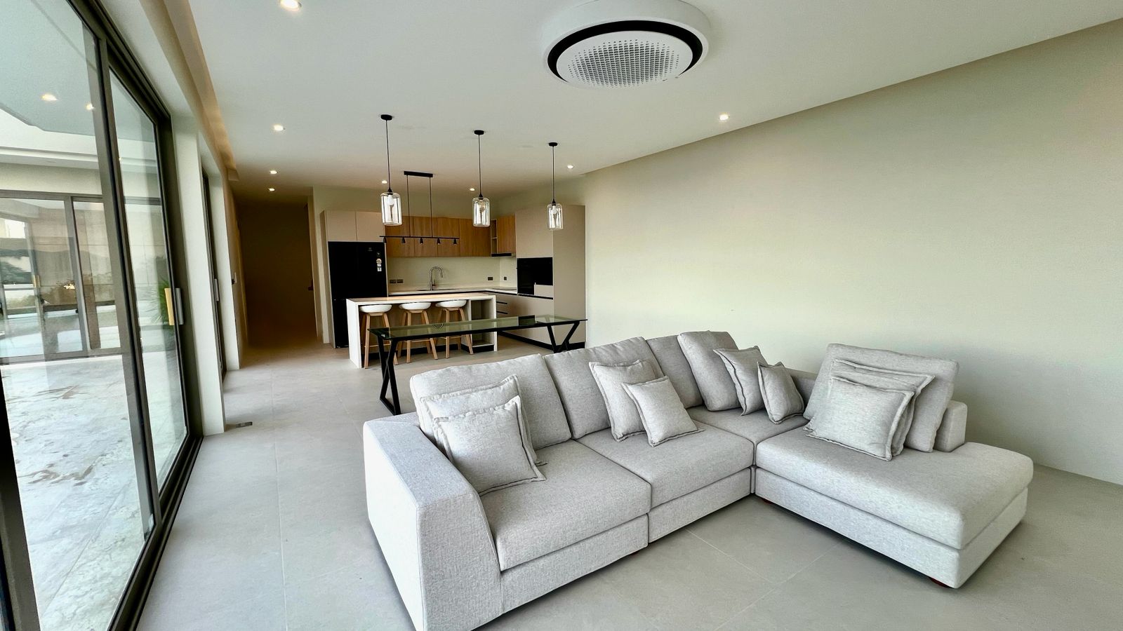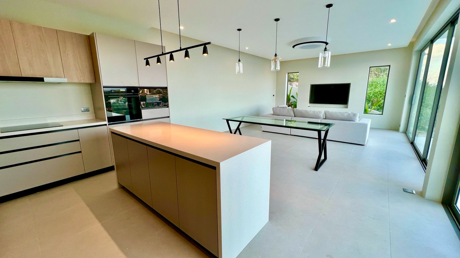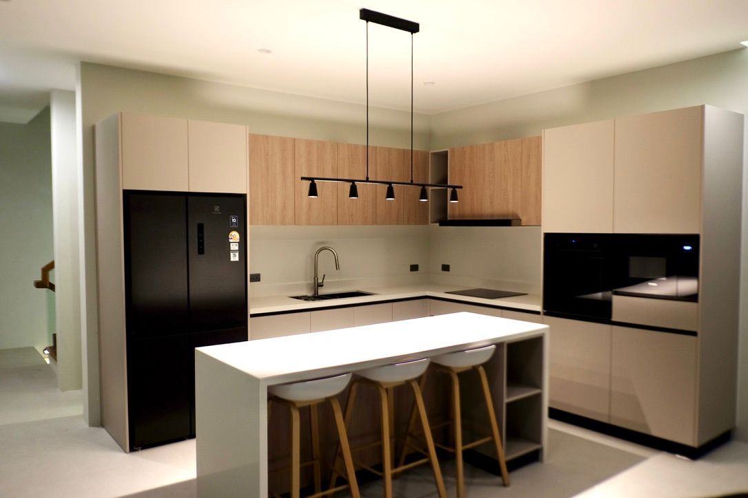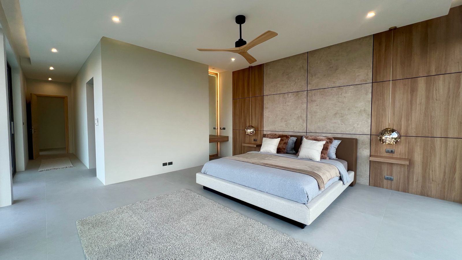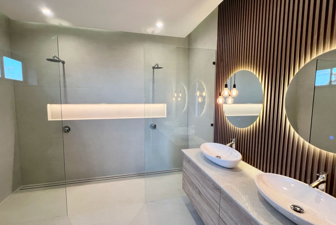 Spanning 305 SQM of meticulously crafted internal space, the villa is designed to maximize natural light through floor-to-ceiling glass sliding doors. The heart of the home is a bespoke Western kitchen, fully equipped with state-of-the-art Bosch appliances, flowing seamlessly into a living area featuring custom-made luxury furniture. An elegant winding staircase, anchored by a statement chandelier, leads you to three spacious en-suite bedrooms. The 50 SQM master suite is a true sanctuary, featuring handcrafted wardrobes and decorative wall paneling that reflect the home’s premium finishes.