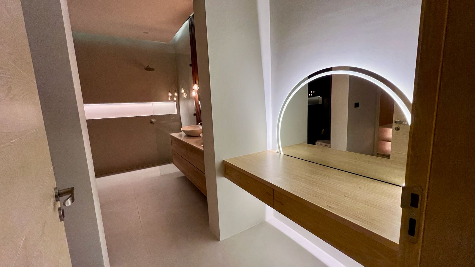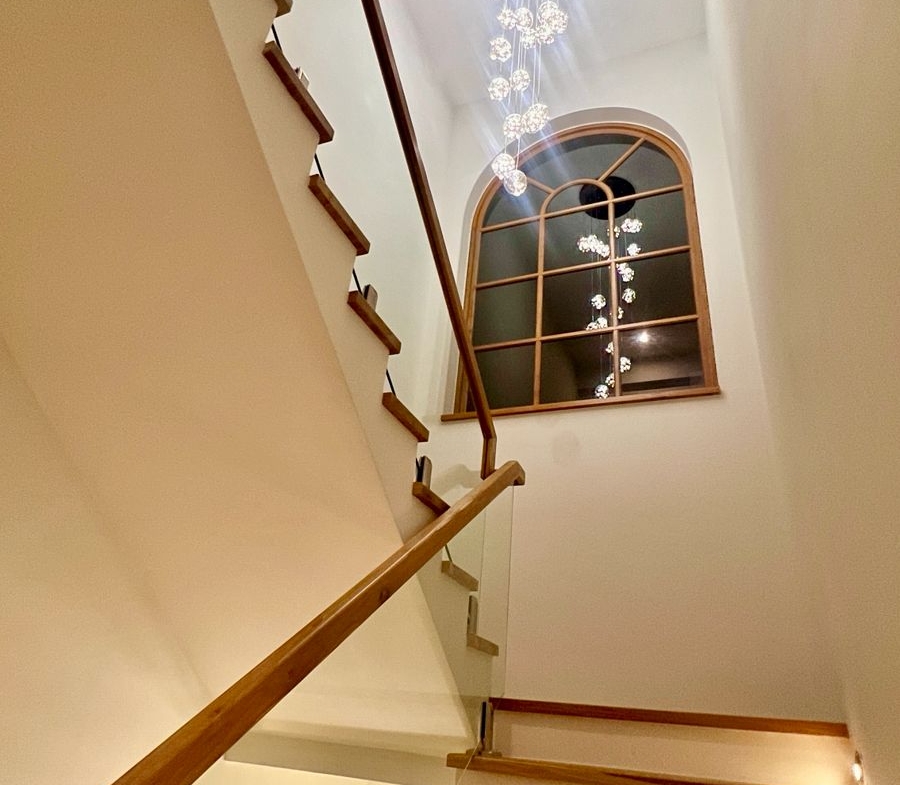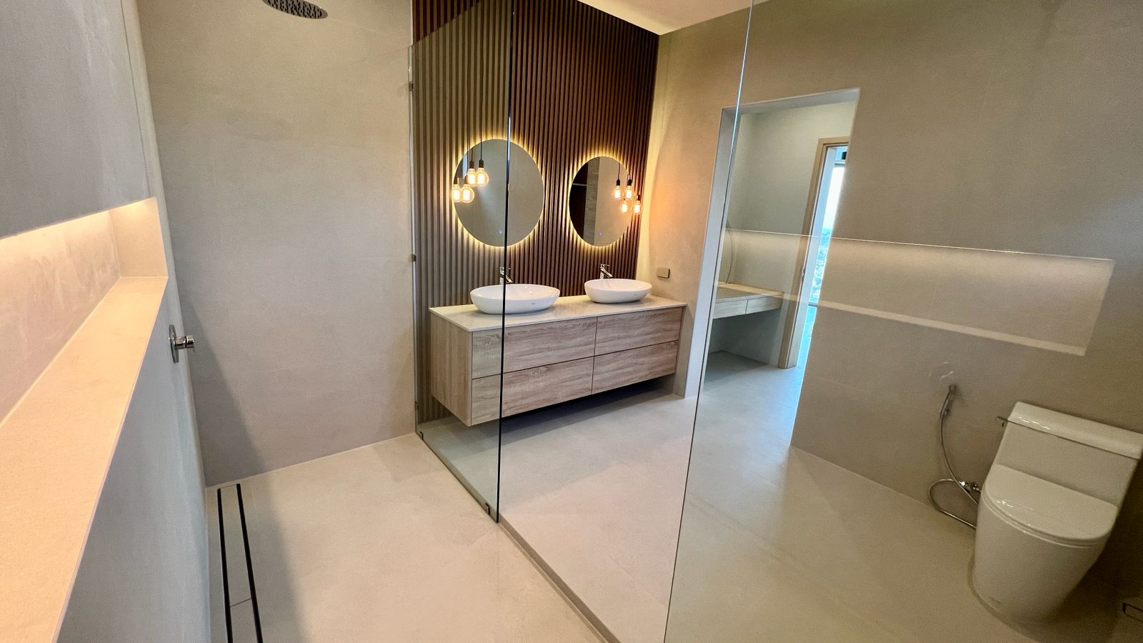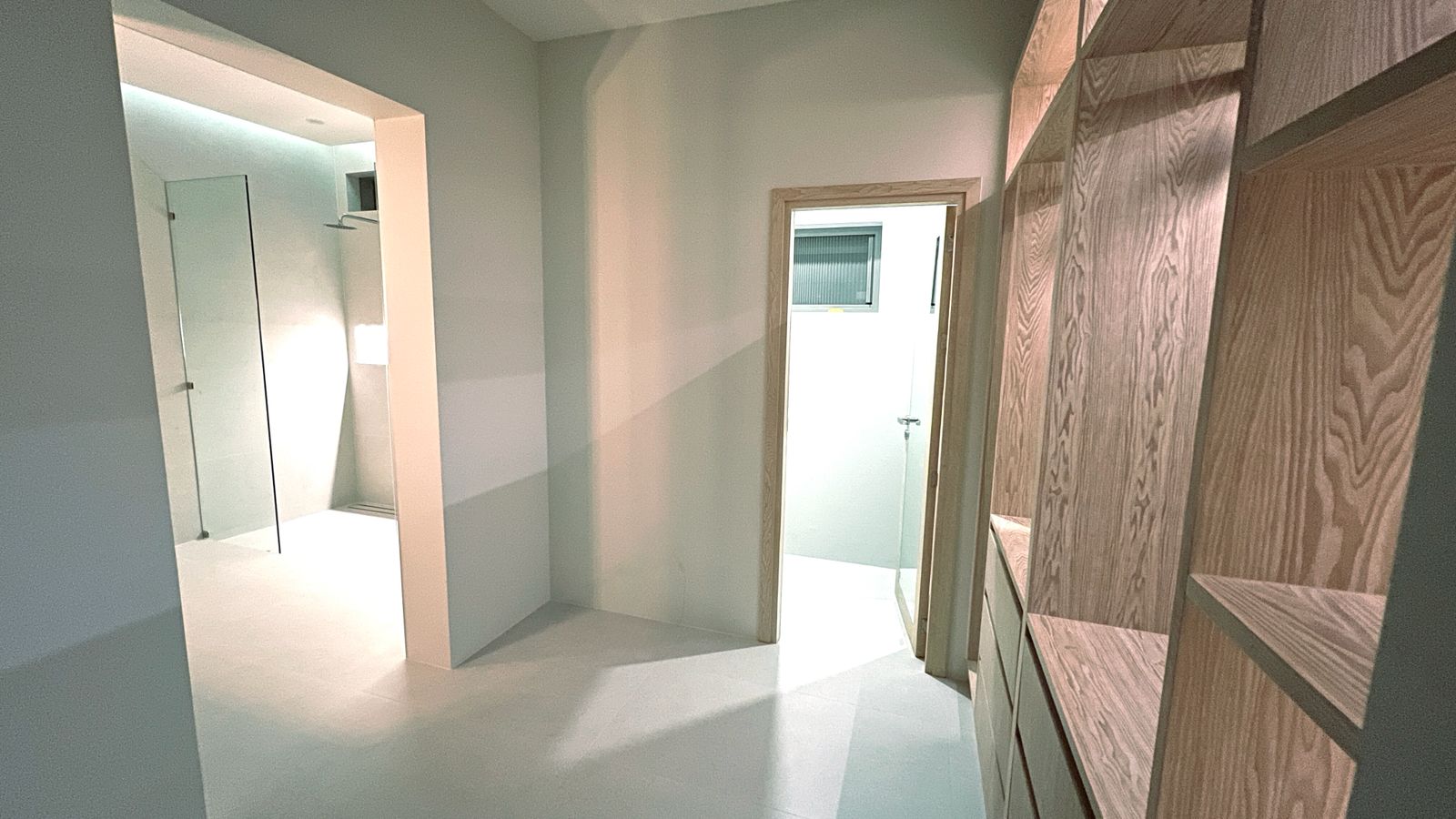Spanning 305 SQM of meticulously crafted internal space, the villa is designed to maximize natural light through floor-to-ceiling glass sliding doors. The heart of the home is a bespoke Western kitchen, fully equipped with state-of-the-art Bosch appliances, flowing seamlessly into a living area featuring custom-made luxury furniture. An elegant winding staircase, anchored by a statement chandelier, leads you to three spacious en-suite bedrooms. The 50 SQM master suite is a true sanctuary, featuring handcrafted wardrobes and decorative wall paneling that reflect the home’s premium finishes.