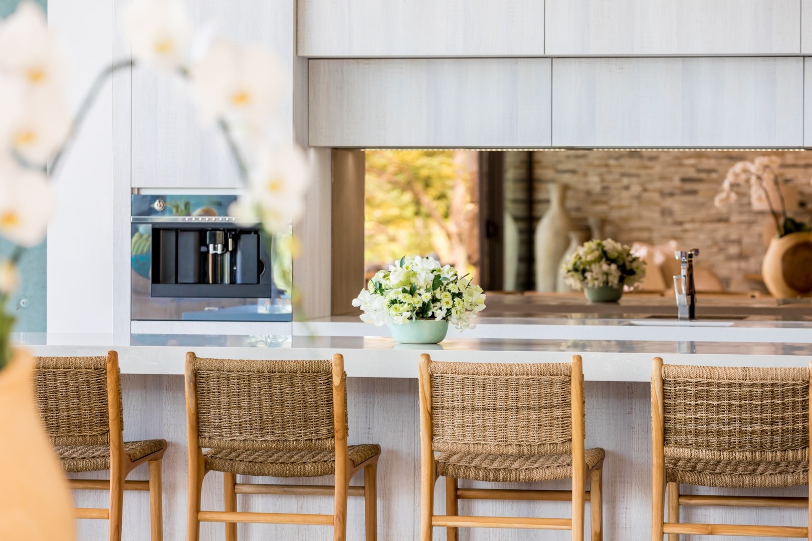An elegant courtyard with water features leads into soaring living, dining, and kitchen spaces framed by custom sliding glass doors. These open to expansive poolside entertaining areas, complete with a built-in BBQ, bar, and outdoor dining. Additional features include a sunken lounge by the pool, a private gym, and a spacious TV lounge. Behind the kitchen are staff and storage rooms, ensuring seamless service and convenience.