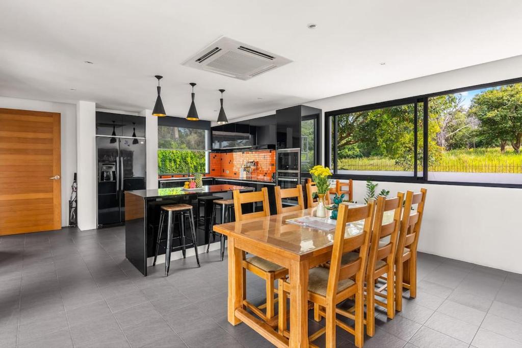 The main living level features a bright open-plan lounge and dining area with a fully equipped modern Western kitchen, ideal for entertaining or relaxed family living. Sliding doors open directly onto the terrace and infinity pool. This level also includes a bedroom suite with ensuite bathroom and walk-in wardrobe, a guest WC, storage room, and internal access to the garage.