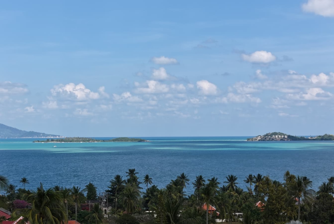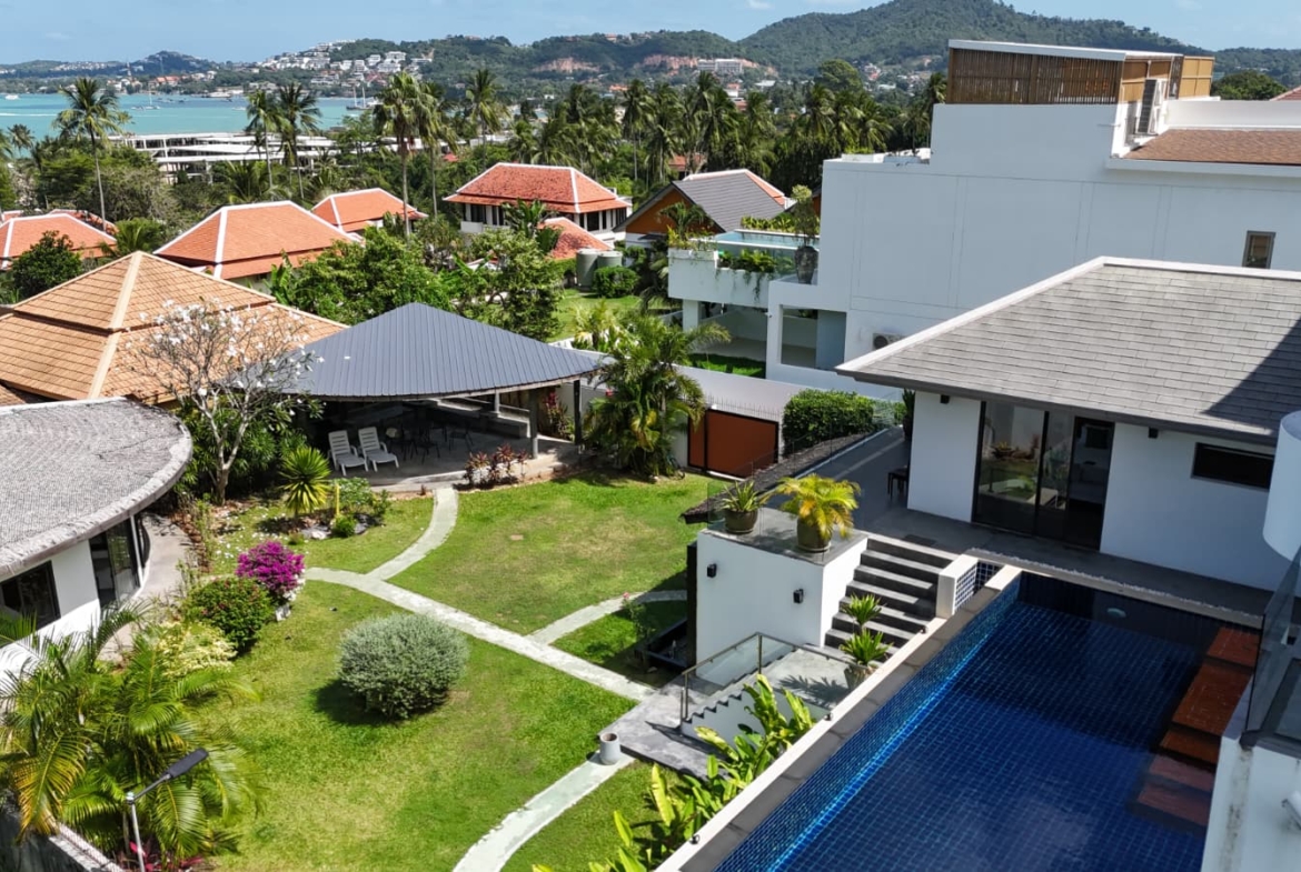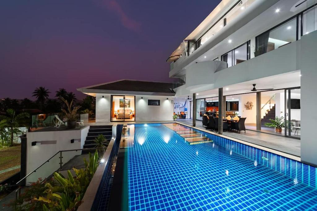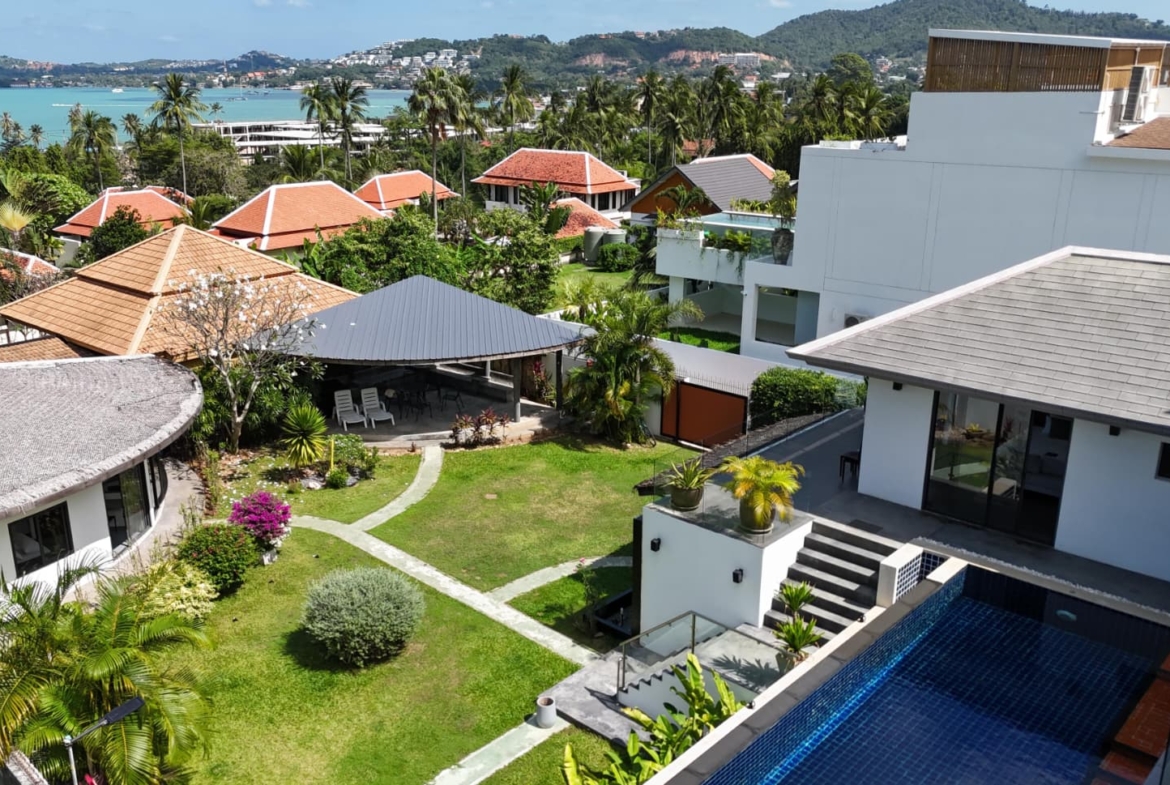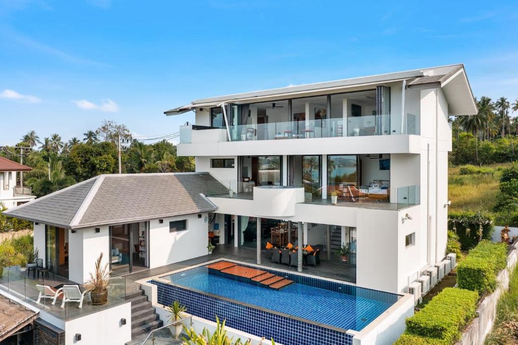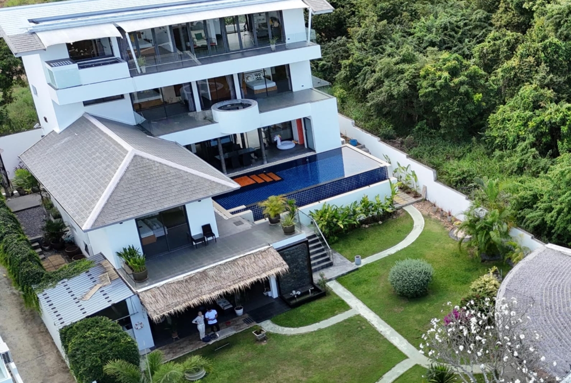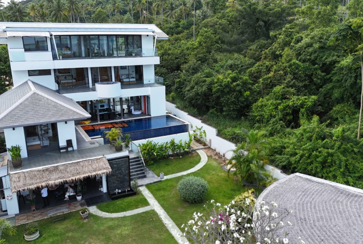This exceptional villa embodies the very best of refined tropical living, set within beautifully landscaped gardens on a private estate of almost 1,000 sqm. Offering approximately 800 sqm of versatile living space arranged over four thoughtfully designed levels, the property delivers an impressive sense of scale, privacy, and luxury. Floor-to-ceiling glass and folding doors frame sweeping views across the Gulf of Thailand towards Koh Phangan while flooding the interiors with natural light and seamlessly blending indoor and outdoor living.