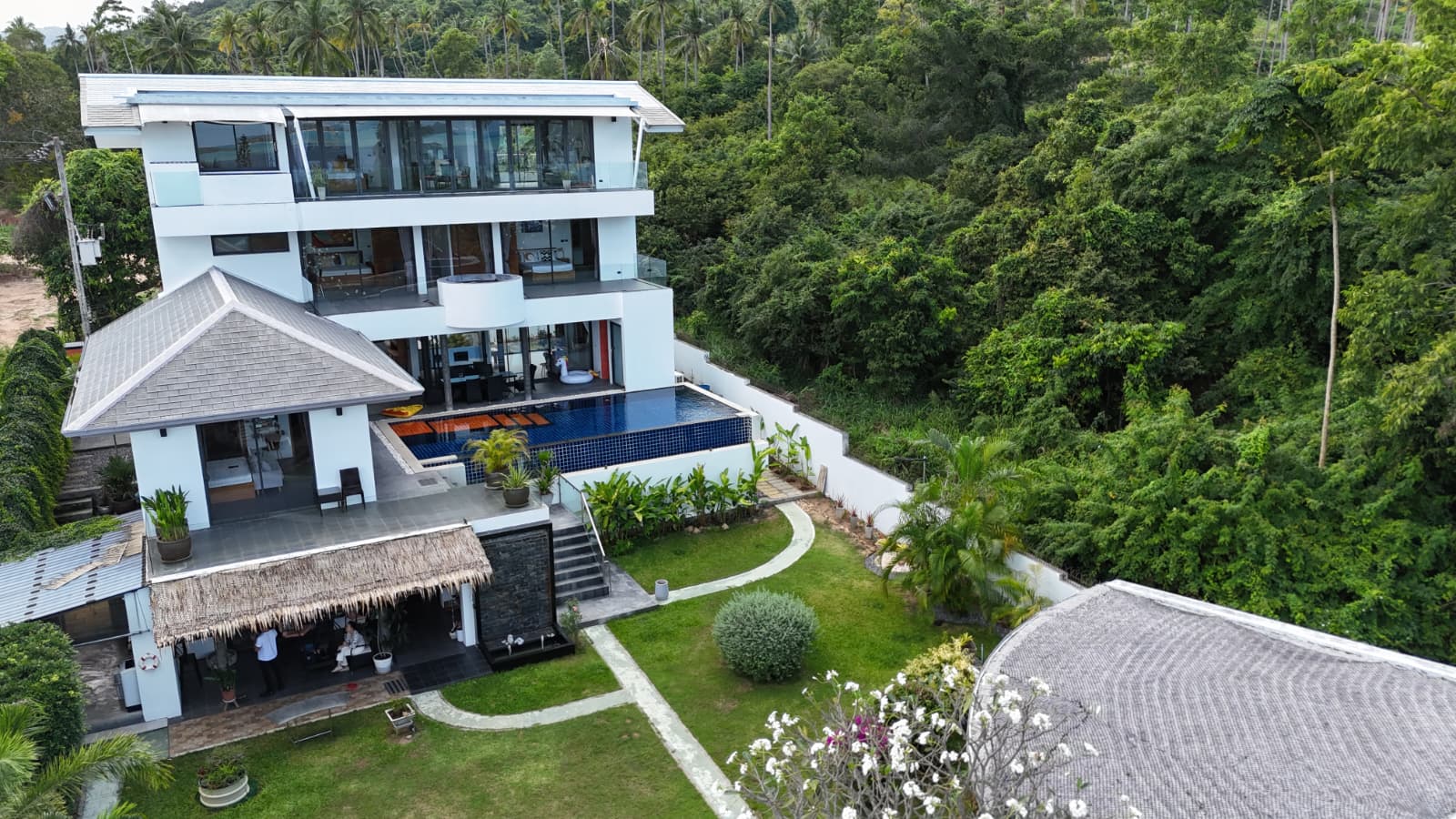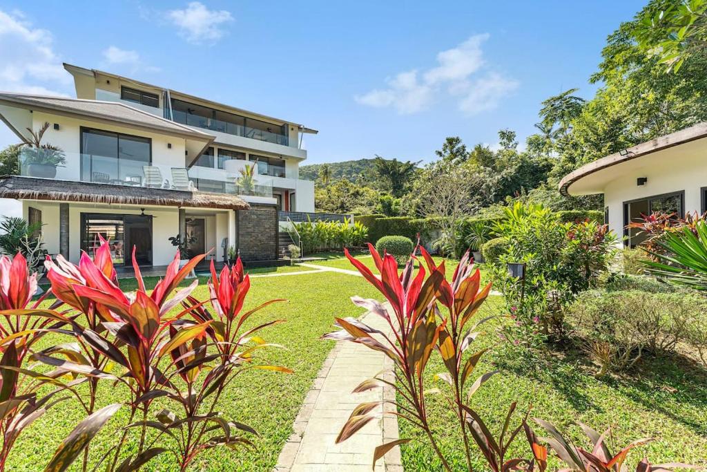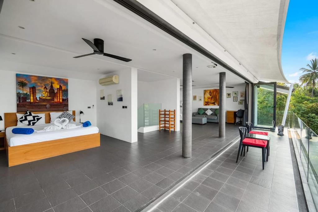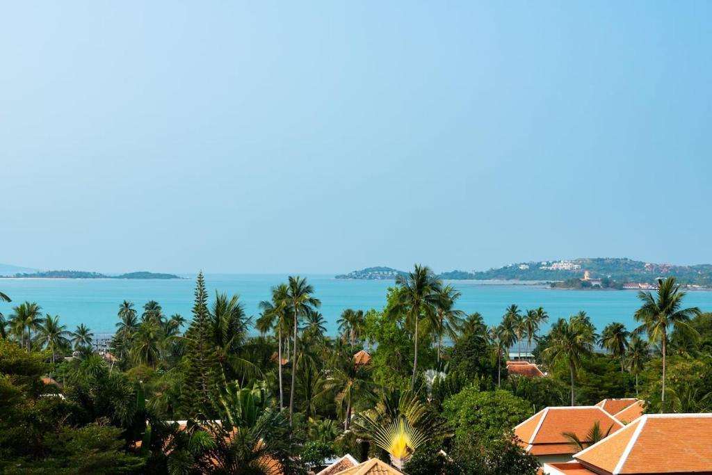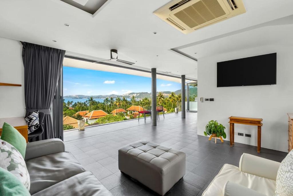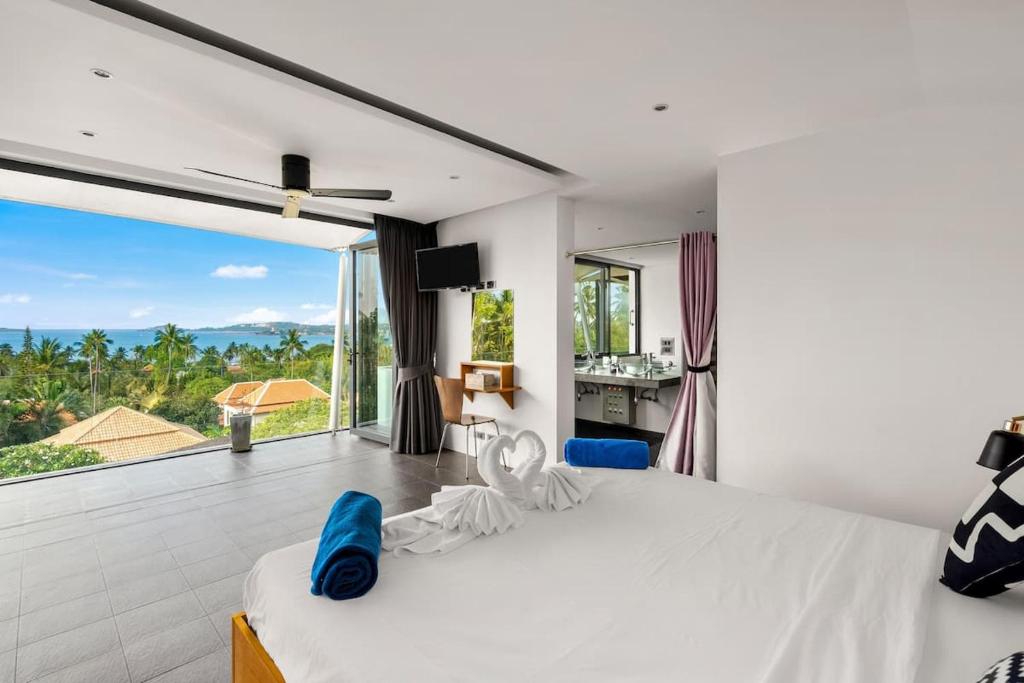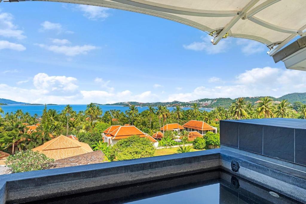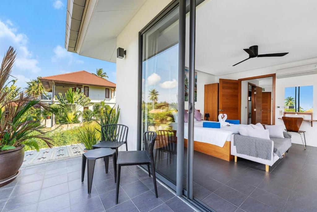This exceptional villa embodies the very best of refined tropical living, set within beautifully landscaped gardens on a private estate of almost 1,000 sqm. Offering approximately 800 sqm of versatile living space arranged over four thoughtfully designed levels, the property delivers an impressive sense of scale, privacy, and luxury. Floor-to-ceiling glass and folding doors frame sweeping views across the Gulf of Thailand towards Koh Phangan while flooding the interiors with natural light and seamlessly blending indoor and outdoor living.
