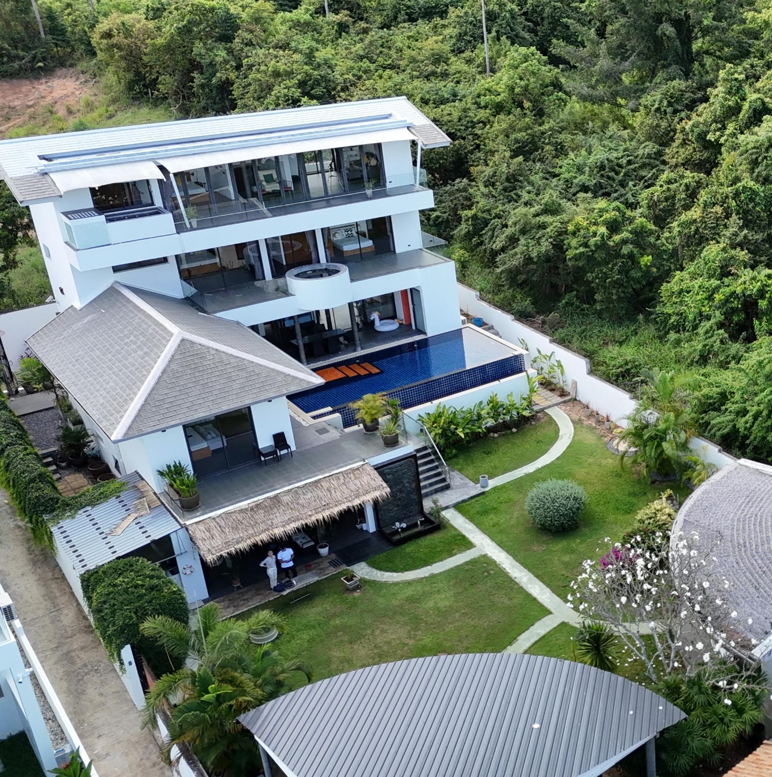 Set within the gardens, the lower pavilion offers two identical ensuite guest bedrooms and a spacious covered sala with BBQ area, perfect for alfresco dining and entertaining. Completed in 2016 to European engineering standards and built by a renowned Dutch construction company, this villa combines outstanding design with exceptional structural integrity and long-term peace of mind.