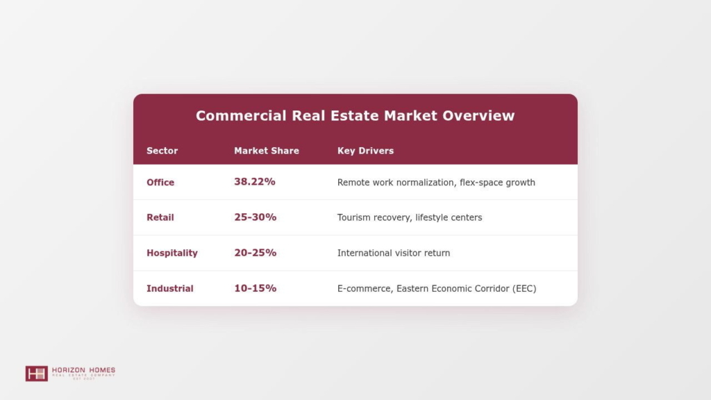 The Thailand commercial real estate market demonstrates healthy diversification across property types, corroborated by research from Knight Frank ThailandColliers Thailand, and Savills Thailand: