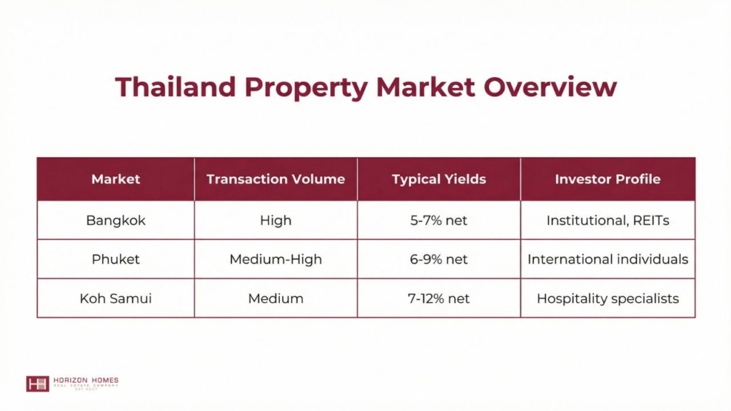 Bangkok vs. Phuket vs. Koh Samui commercial markets reveal distinct risk-return profiles: